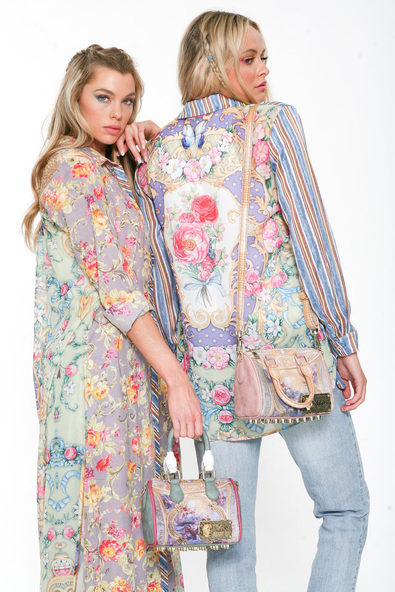 Add some playful flair to your wardrobe with the Villa Del Sol Shirt. Featuring a unique stripe/floral contrast design and a crystal button in front, this top is perfect for any occasion. Plus, it's easy to care for - simply machine wash with warm water and line dry. Made from 100% polyester for ultimate comfort.